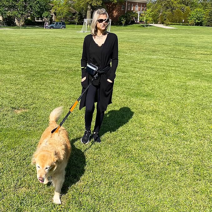 • DOUBLE SHOCK ABSORBERS – Our hands-free dog leash features 2 shock-absorbers to help provide a bit of “give” when out with your furry friend. This leash has the perfect degree of flexibility, reduces stress from pulling and tugging. The length of the leash is 51" when the bungee is relaxed and can be extended up to 62". Quickly use the handle by your hip to guide dog back on track. Or the additional collar handle allows for even more safety and control when entering high traffic areas.