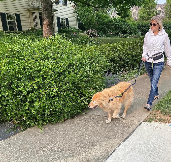 • DOUBLE SHOCK ABSORBERS – Our hands-free dog leash features 2 shock-absorbers to help provide a bit of “give” when out with your furry friend. This leash has the perfect degree of flexibility, reduces stress from pulling and tugging. The length of the leash is 51" when the bungee is relaxed and can be extended up to 62". Quickly use the handle by your hip to guide dog back on track. Or the additional collar handle allows for even more safety and control when entering high traffic areas.