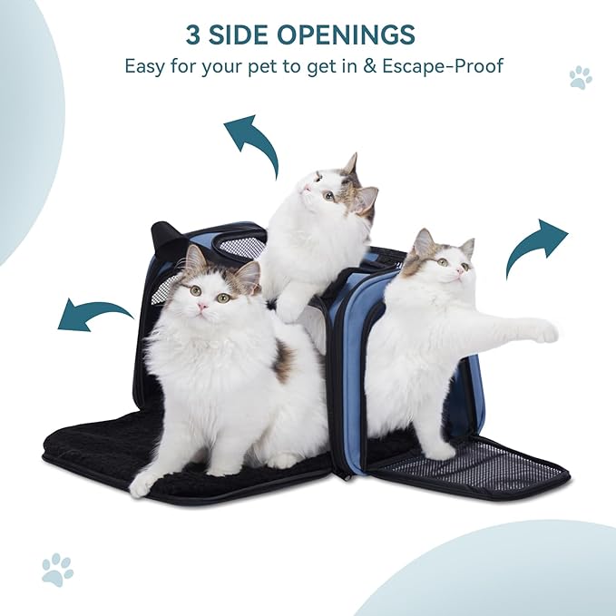 • [Perfect for Travel] Our tsa approved pet carrier is easier to get pets in or out because it has 1 top opening and 2 side doors. The pet carrier features 4 mesh panels not only for ventilation but also easy for you to check on your pet. The escape-proof locking zippers and safety hook keep your pet safe.