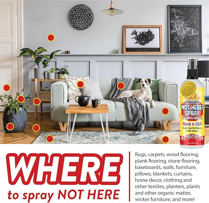 • USE IN CONJUNCTION WITH A HOUSEBREAKING TRAINING PLAN: When our Not Here! Spray is sprayed on a soiled area, the formula will eliminate the scent so your pet will not want to use that area anymore. Our formula acts as a deterrent therefore your puppy will not come back to the area to urinate.