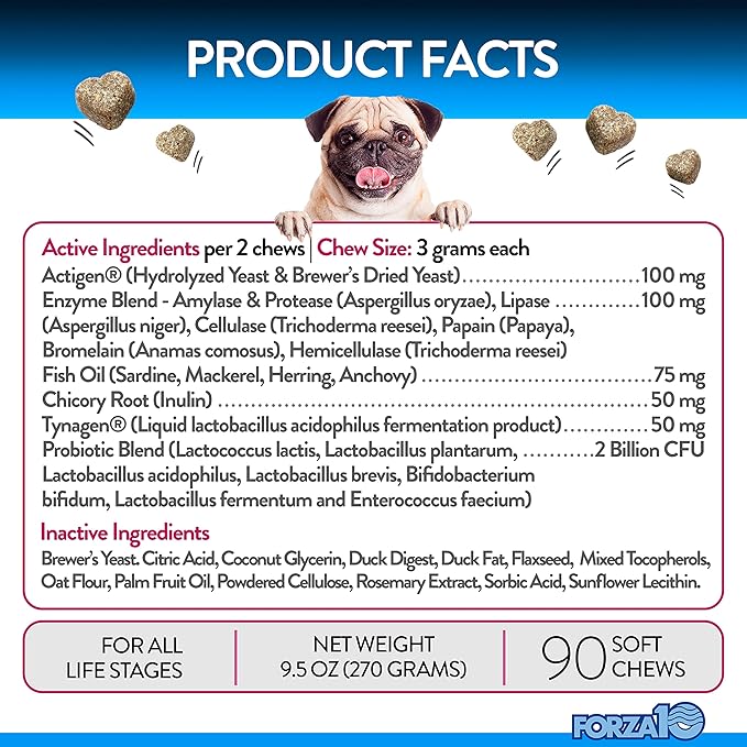 Forza10 Dog Probiotics and Digestive Enzymes Chews Supplements, Duck Flavor Probiotics for Dogs Digestive Health and Gut, Pet Probiotics for Dogs with Diarrhea, Dog Gas Relief, Upset Stomach, 90 Ct.