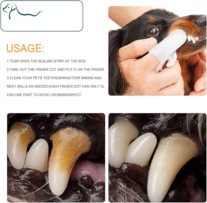 • 【Easy To Use Finger Cots Design】- It's slimmer, so it slides easily between the dogs cheeks and teeth, allows you to reach & feel each tooth and won’t slip off your finger. Simply wrap the soft wipe around your finger and wipe your pet's teeth, so you can actually feel the teeth. And then specially designed wipe allows the pet owner to be guided by their own touch when cleaning their pet’s teeth