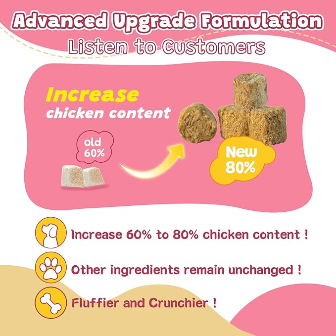 • Made with Pure Raw Ingredients: We follow the dog's instinct by using raw. Our dog glucosamine freeze dried treats are so delicious and in perfect size, made with raw chicken breast. The freeze-drying technology can better lock in the nutrients and flavor, and make it shelf stable. Even the pickiest pets will love our crunchy treats. Made without grain, corn, gluten, soy, artificial colors or preservatives, and Non-GMO.