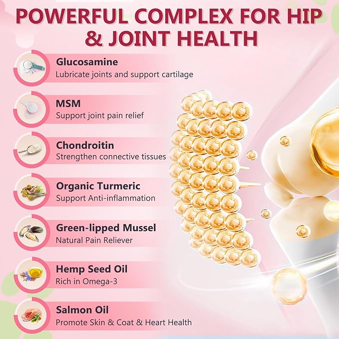 • Focus on Dog Pain Relief & Anti-inflammation: After a whole day of energetic playtime, your pets must be ending up with painful joints or paws. Our advanced formula uses natural turmeric, chondroitin, salmon oil, hemp seed oil and green lipped mussel which are rich in omega-3 that helps reduce inflammation and relieve limp & swelling. Dog joint and hip supplement also helps support joints lubrication, promote cartilage health, protect connective tissues, and improve mobility function.