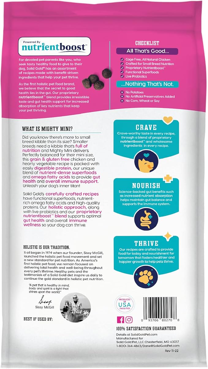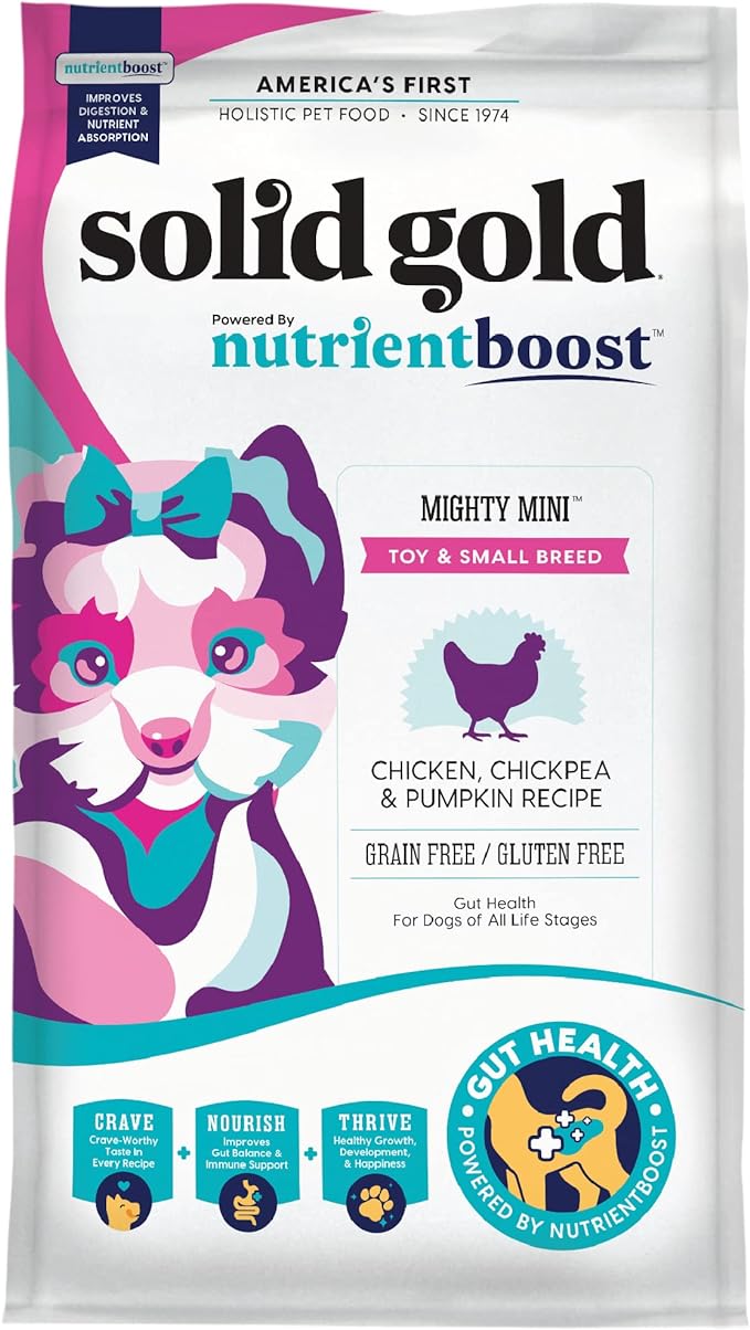 • Mighty Good for Little Dogs - Solid Gold nutrientboost Mighty Mini is a natural small breed dry dog food that supports gut, immune, and coat health for your small puppy, adult, or senior dog.