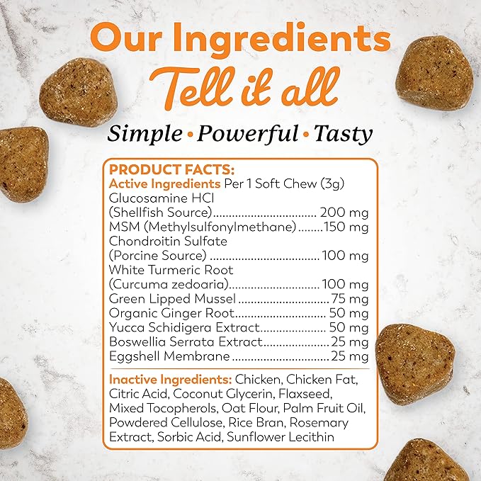• Joint Health and Hip Mobility - Dr. Harvey's Hip and Joint Soft Chews are formulated to support your dog's joint health and mobility. The combination of Glucosamine HCI, MSM, Chondroitin Sulfate, and Green Lipped Mussel work together to repair and protect joint tissue, reduce inflammation, and improve joint mobility. These are Dairy Free, Soy Free, and Gelatin Free. With daily use, your dog can enjoy improved joint health and move with ease.