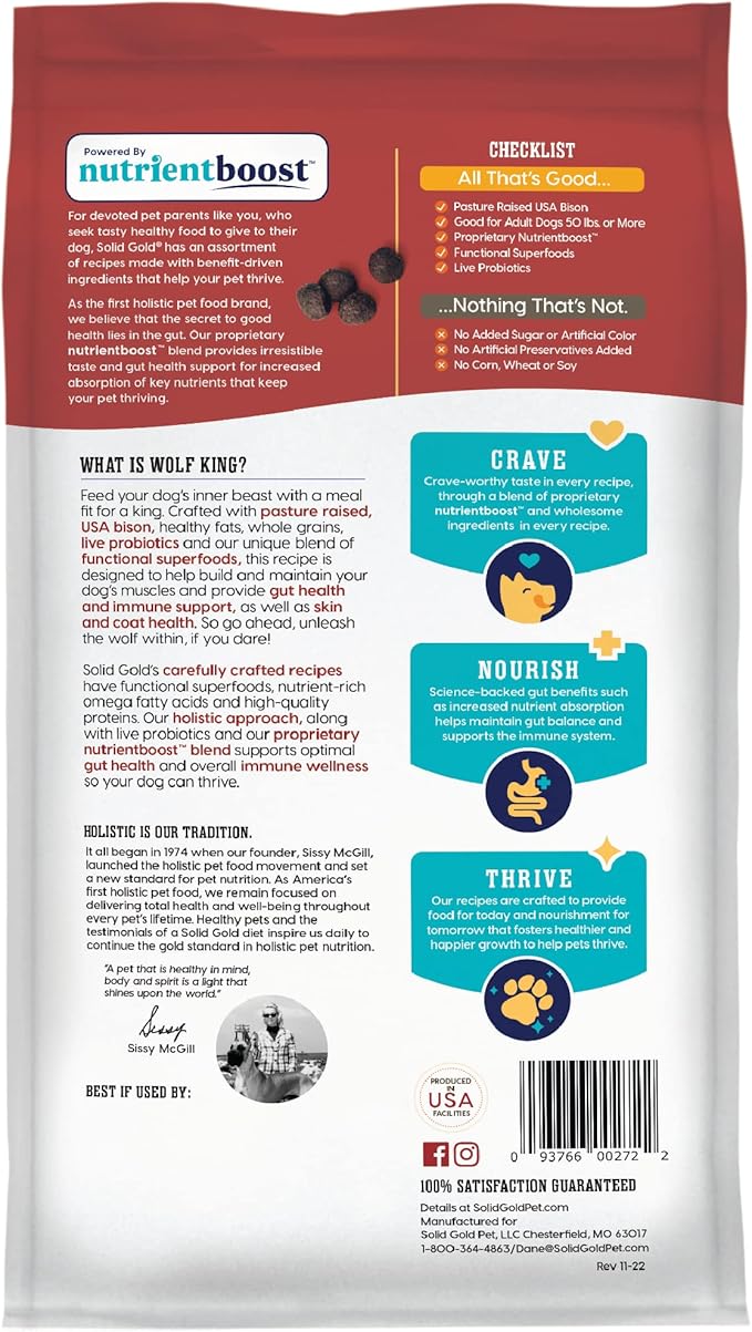 Solid Gold Nutrientboost Wolf King Large Breed Dog Food - Whole Grain Dry Dog Food Kibble Made with Real Bison, Brown Rice & Sweet Potato - Omega 3, Superfood & Digestive Probiotics - 11 LB Bag
