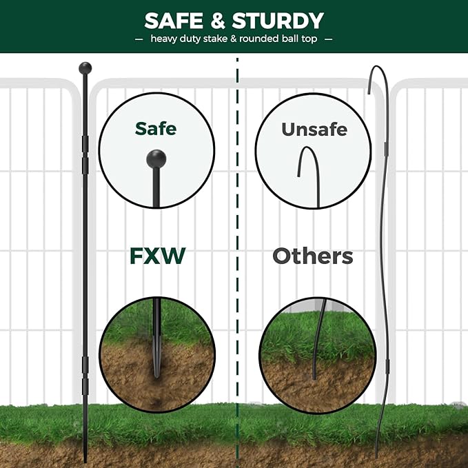 • đŸ¶ă€Multi-scenario use】The FXW dog playpen features a powder coating that will help protect against rust and extend its life, which makes it ideal for RV camping, traveling, or for use in the yard. When used indoors, we recommend placing it on a dog pad or carpet to prevent the rods from scratching the floor, or please try our new floor protectors or dog pee pad for the same purpose.