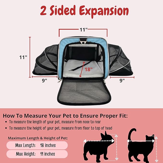 • TWO SIDED EXPANSION: Both sidewalls expand into a roomy extension, giving your pet room to turn around and sprawl out. The mesh lining also gives them a chance to see your face, keeping them calm and happy. This is especially helpful for older pets and pets with joint problems.