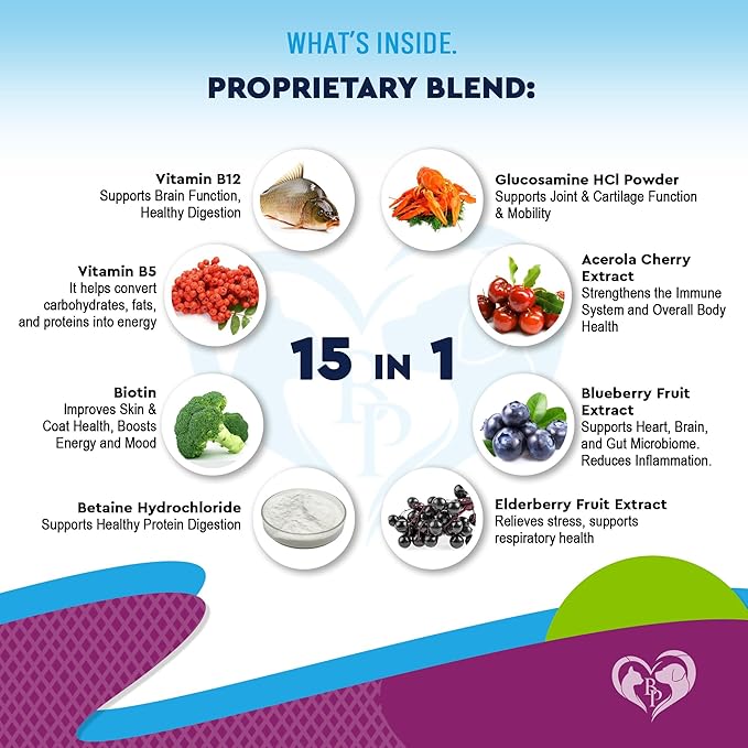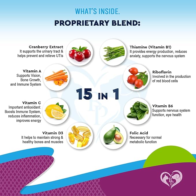 • ✅ 15-in-1 CATS & DOGS MULTIVITAMINS : It is a remarkable 15-in-1 multivitamin complex that offers comprehensive health support for your pets. Whether a puppy, an older dog, or a feline friend, this formula includes vitamins A, B1, B2, B6, B12, C, and D3, natural extracts, and more. It’s packed with antioxidants and essential animal vitamin sets that boost immunity, energy, and overall well-being. Can be used with food, treats, chews, powder, treat, bites.