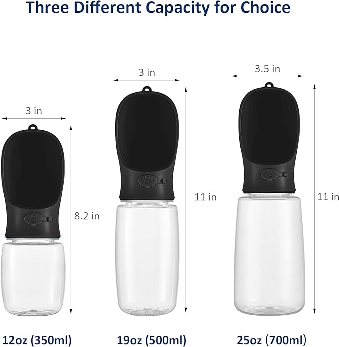 • [Color & Size]: Black. The water bottle could hold max 25 fl oz (700ml) of water and the food can could hold 6 fl oz (about 100g) food. This choice would be suitable for large dogs, or if you wanna take your puppy for a long walk like hiking or traveling.