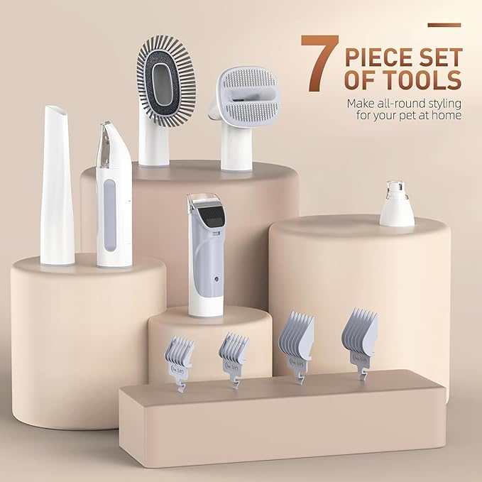• 【7 in 1 Professional Grooming Set 】 This pet grooming clipper comes with 8 proven grooming tools; Nozzle heads and cleaning brushes can be used to collect pet hair that has fallen on carpets, sofas and floors: grooming brushes and hair removal brushes that help prevent damage to hair surfaces while promoting soft, smooth, healthy pet skin; Electric scissors provide superior cutting performance.
