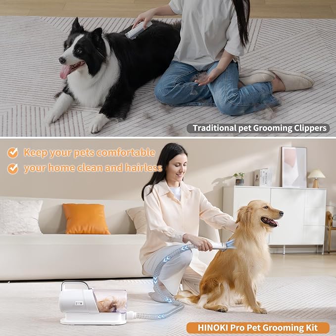 • 【 Restore a tidy house 】HINOKI Pet Grooming Set. 15kPa suction is equivalent to a miniature vacuum cleaner, which can easily clean and collect clothes, beds, sofas, corners and other hair, and solve the bed/sofa/car/keyboard crevices of dust.