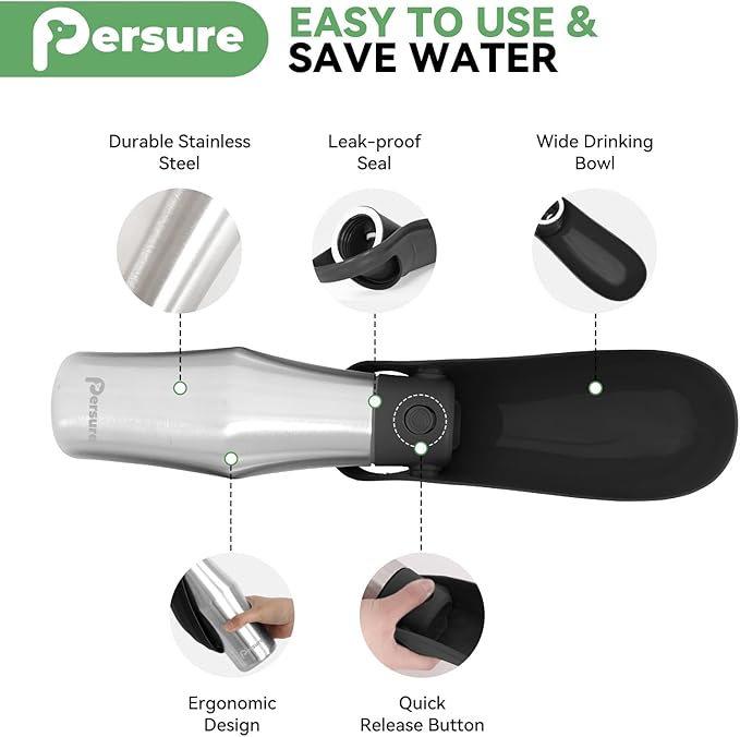 • 🐕【Food-Grade & Durable Material】Persure dog water bottle is made of stainless steel and BPA-free PP plastic. Compared with silicone, PP plastic is odorless and BPA-free, ensuring the health of your furry friend. Persure uses high-quality food-grade materials, making it drop-resistant and more durable.