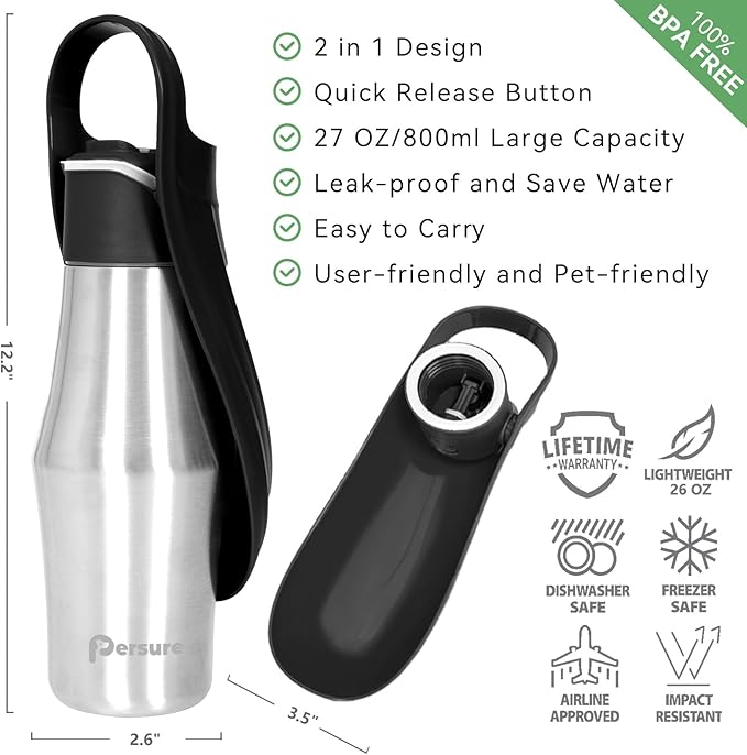 • 🐕【2-in-1 Dog Water Bottle & Bowl】The Persure portable dog water bottle is a must-have for pet owners on the go! With a capacity of up to 27 oz of fresh water and a wide water bowl design, your furry friend can drink comfortably and naturally. Perfect for all dog sizes, such as Schnauzer, Labrador, and more. The arched handheld design makes it easy to carry, and the unique design is both user-friendly and dog-friendly.