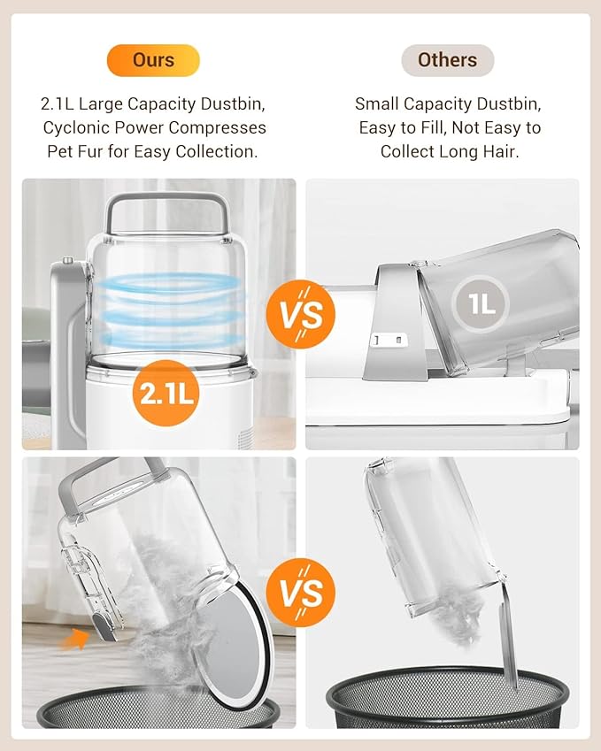 • The pet grooming vacuum kit is equipped with a 2.1L upgraded dust cup and 70.8in thickened hose, Whether it's for multi-pets or large dogs, grooming can be done at one time. The dust cup can be removed separately. Our dog hair vacuum also has a circular storage design, which won't take up too much space.