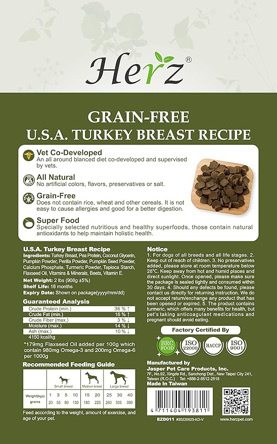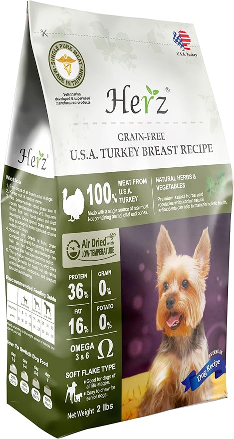 Herz Air-Dried Dog Food – U.S.A Turkey Breast Recipe 2 lb, Single Pure-Meat, Grain Free, All Natural, High Protein, Limited Ingredients