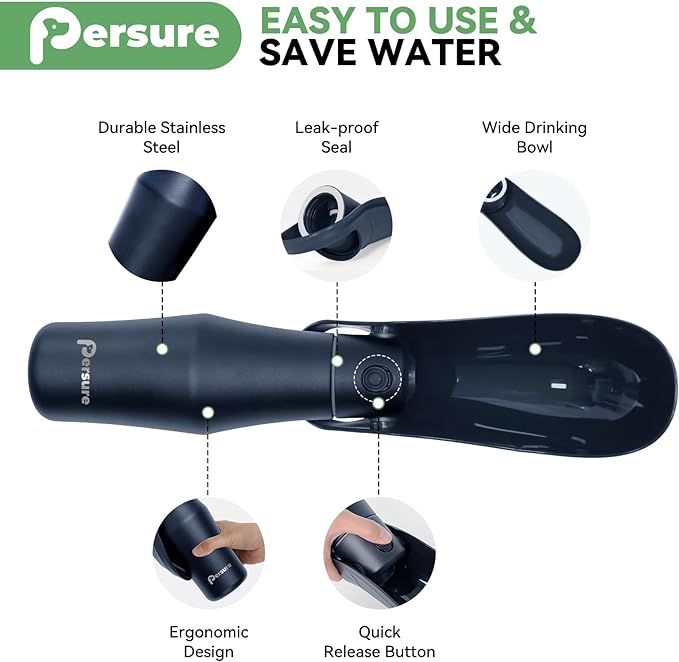 • 🐕【Food-Grade & Durable Material】Persure dog water bottle is made of stainless steel and BPA-free PP plastic. Compared with silicone, PP plastic is odorless and BPA-free, ensuring the health of your furry friend. Persure uses high-quality food-grade materials, making it drop-resistant and more durable.