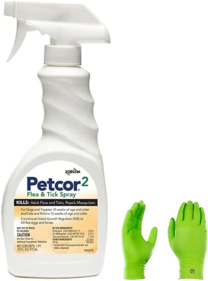 Petcor Pet Flea & Tick Spray - Easy-use Spray - Kill Ticks, lice, Fleas, and Mosquitoes on Dogs, Cats, Puppies, and Kittens | USA Supply Gloves | USA Supply Pest Identification Card