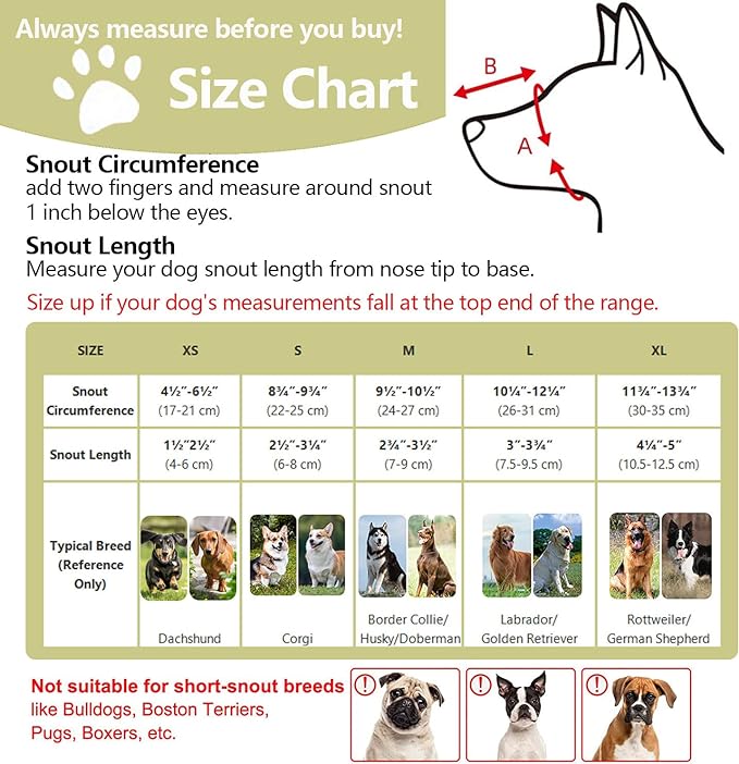 • MEAURE BEFORE BUYING: Add two fingers, then measure around top of snout about ½" below eyes. The extra space is vital for your pet's safety and comfort. The size chart is for reference only. For your pet's comfy, please measure before buying. 5 sizes available for Border Collie, Husky, Golden Retriever, German Shepherd and so on. [NOT suitable for SHORT snout dogs such as Pitbull and Boxer.