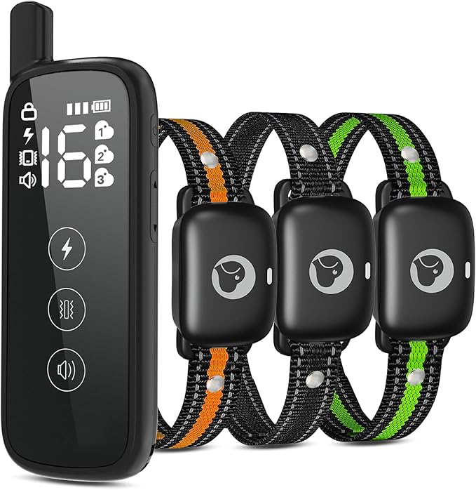 • Dog Training shock collar: Our 3 pack shock collar for dogs offers 3 Humane training modes including vibration, beep, and adjustable shock levels (1-16) that adjust the level depending on your dog's needs and temperament. Also this dogs shock collar with remote control has 3 channel, which means you can train 3 dogs at the same time, perfect for multi-dog families. It's great for helping correct dog’s bad behavior!
