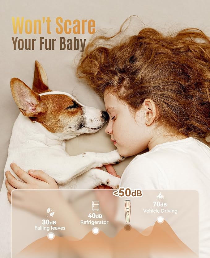 • 🐶【50dB Ultra Quiet】: Dog hair clippers using an upgraded motor, which provides high speed and less vibration,effectively controls the noise within 50dB,and helps dogs feel relaxed and no longer afraid of haircuts.