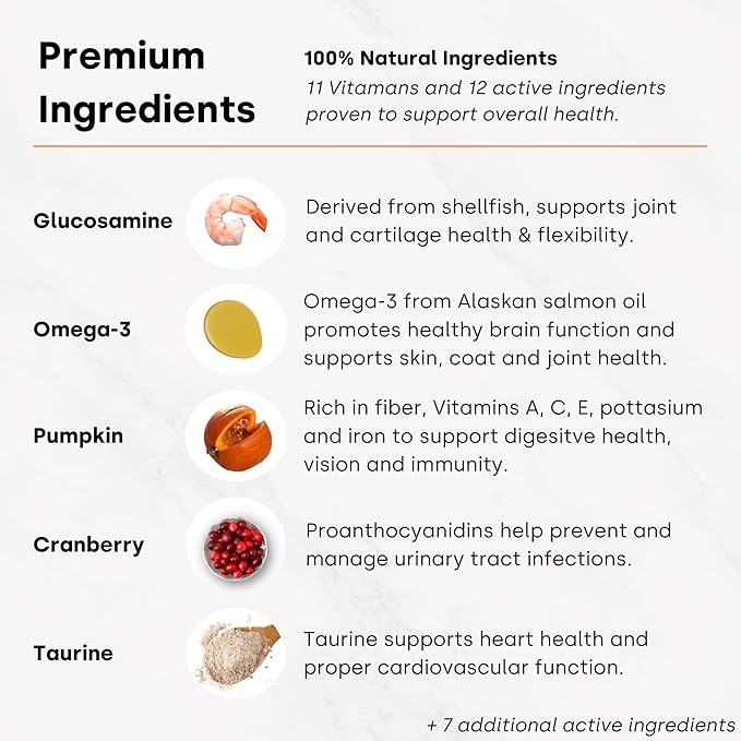 • Active Ingredients : Pumpkin, Glucosamine, Chondroitin, Postbiotics, Essential Vitamins, Taurine, Cranberry