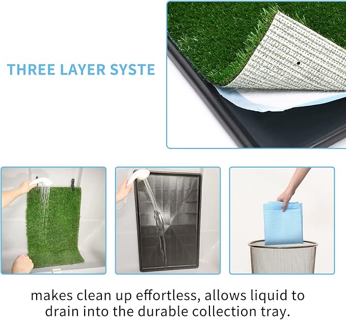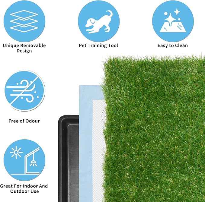 • ✅5 DISPOSABLE PEE PADS: The dog grass pad with tray system come with an incredible dog pee pad solution. Advanced absorption technology from Japan,when the drainage holes get the liquids to travel downwards, Oiyeefo puppy pee pad catch the urine and absorb it quickly, so the extreme odor-causing issues can be easily curbed.