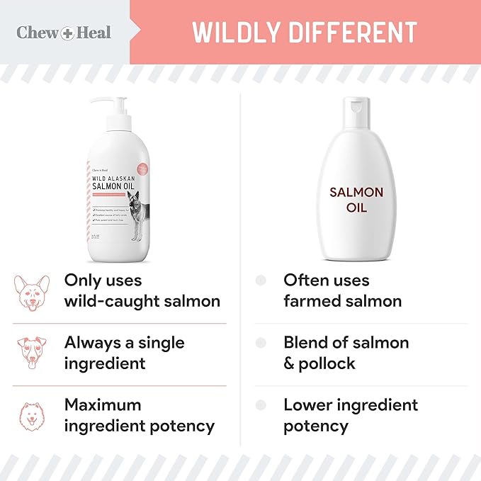 • Chew + Heal Wild Alaskan Salmon Oil is made without additives and preservatives. The only ingredient in this product is pure Wild Alaskan Salmon Oil, making it a great, all-natural option.