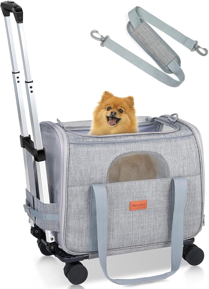 Morpilot Dog Carrier with Wheels Pet Carrier Airline Approved, Cat Carrier with Wheels Large for 2 Cats, Rolling Puppy Stroller Detachable and Foldable Pet Travel Bag Gray
