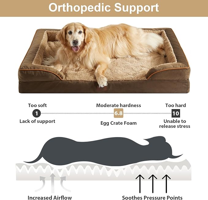 • MADE FOR COMFORT: The orthopedic dog bed features 3.5 inches of high-density egg foam to support and relieve your fur baby's muscles and joints. The large dog bed can provide extra support and safety, relieve joint pain or arthritis, and is a great choice for elderly and sick dogs.