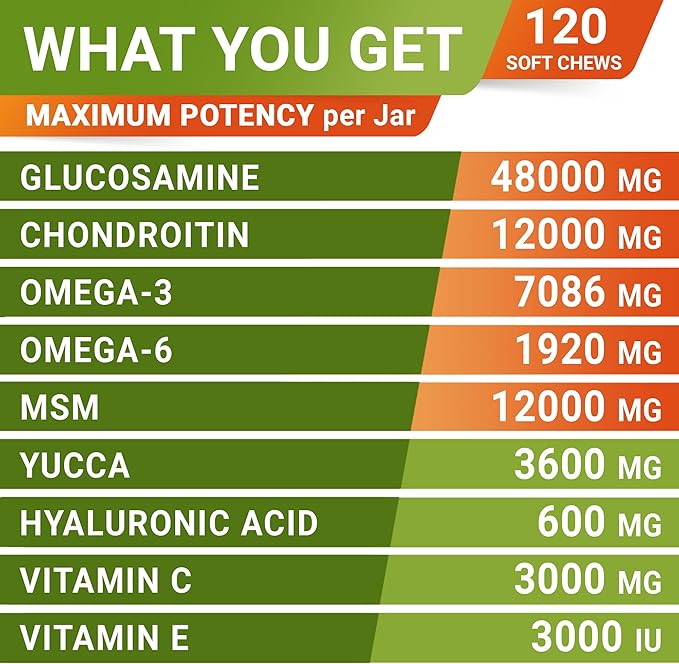 • Proven Excellence: For years, our dog glucosamine and chondroitin supplement for large dog has been advancing canine wellness. Leading as one of the best hips & joints supplements to help with joint pain relief and extend active years for old paws.
