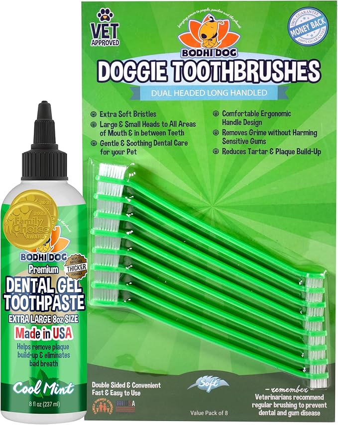 Bodhi Dog Dental Gel Freshens Bad Breath & Reduces Tartar & Plaque Build Up + Dual-Headed Long Dog Toothbrush | Safe and Super Soft Bristles for Gentle Pet Dental Care | Oral Care Bundle for Pets