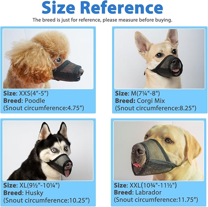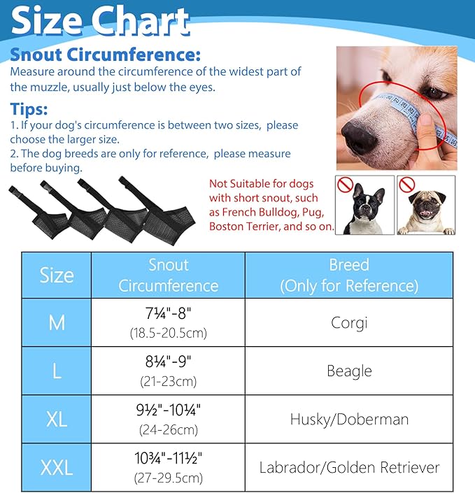 • 4 Pieces Dog Muzzle Suits: This dog muzzles for medium dogs set is suitable for dogs with a snout between 7¼-11½". These muzzle for medium sized dog are fit for most medium and large dogs, such as Beagles, Husky, Dobermans, Border Collies, Labrador retrievers, Rottweilers, German shepherds, Golden retrievers, and so on. You can choose the right size range for your dog, so you don't have to worry about size selection and avoid unnecessary waste!