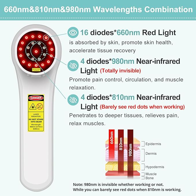 • 【Red Laser Therapy】 The dog therapy laser combines perfectly of 16*650nm & 4*810nm & 4*980nm red light. The 980nm optimizes the action on thermal for a rapid analgesic effect, resulting in improved pain control, muscle relaxation. The 810nm help dogs with arthritis and spinal pain. The 650nm lamp frequency can easily be absorbed by the skin to improve blood circulation. (Note: 810nm is invisible to the naked eye while working; 980nm is invisible to the naked eye and camera while working.)