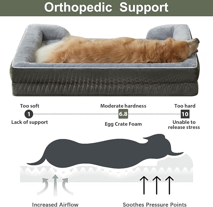 • MADE FOR COMFORT: The orthopedic dog bed features 3.5 inches of high-density egg foam to support and relieve your fur baby's muscles and joints. The large dog bed can provide extra support and safety, relieve joint pain or arthritis, and is a great choice for elderly and sick dogs.