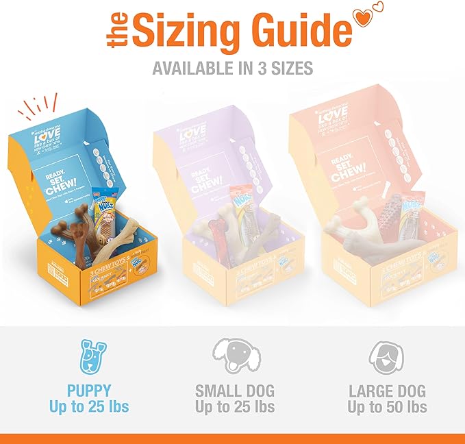 • 3 STRONG PUPPY CHEW TOYS AND A TASTY EDIBLE TREAT - This gift box includes an easy-hold wishbone chew toy, a stick-inspired chew toy, and a chew toy in an authentic bone shape—plus a delicious chew treat!