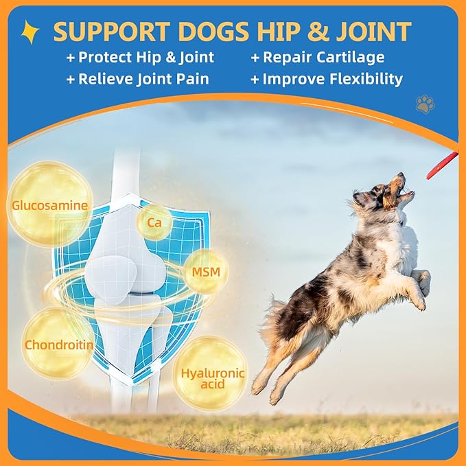 • DOG HIP & JOINT SUPPLEMENTS - Senior dog supplements is necessary. ZEBORA Contain high amount of active ingredients in ZEBORA All-in-One Dog Supplement, including chondroitin for joint protection, glucosamine for rebuilding cartilage, MSM for reducing inflammation and Hyaluronic Acid for relieving pain. Their blend helps support dog's overall joint health. Helps improve mobility and flexibility. Additionally, Calcium lactate and Phosphorus help to strengthen their bones and teeth.