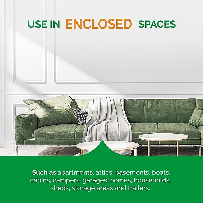 • Product 2: WHERE TO USE: Use in enclosed spaces such as apartments, attics, basements, barns, boat cabins, cabins, campers, crawl spaces, garages, homes, households, sheds, storage areas and trailers.