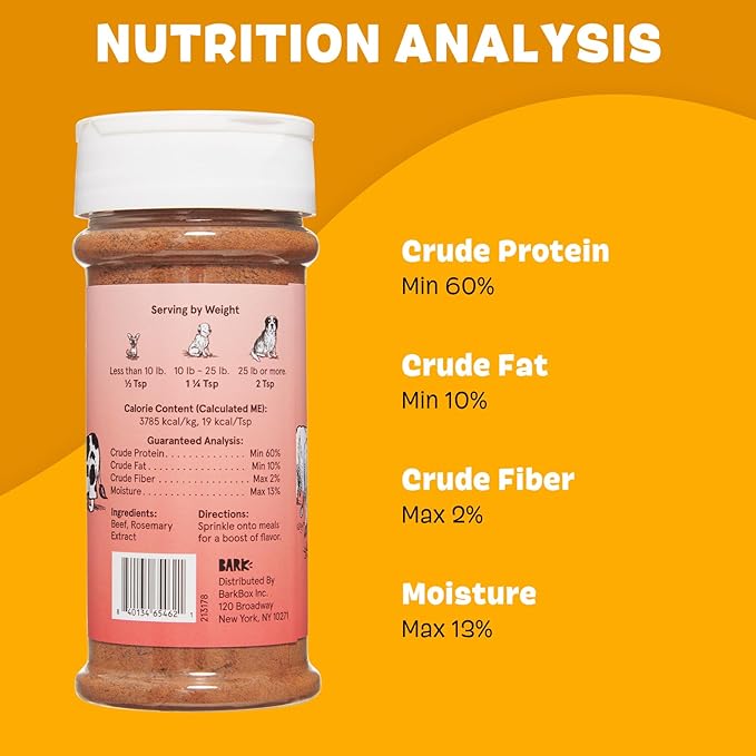 • Protein-Packed Goodness: Embrace the power of protein with BarkBox meticulously crafted beef topper. Formulated with only 2 key ingredients – premium beef and aromatic rosemary – this blend brings together a symphony of taste and nutrition providing an allergy friendly option. Elevate your pup's meal with high-quality protein, ensuring they receive both the flavor they crave and the essential nourishment they need.