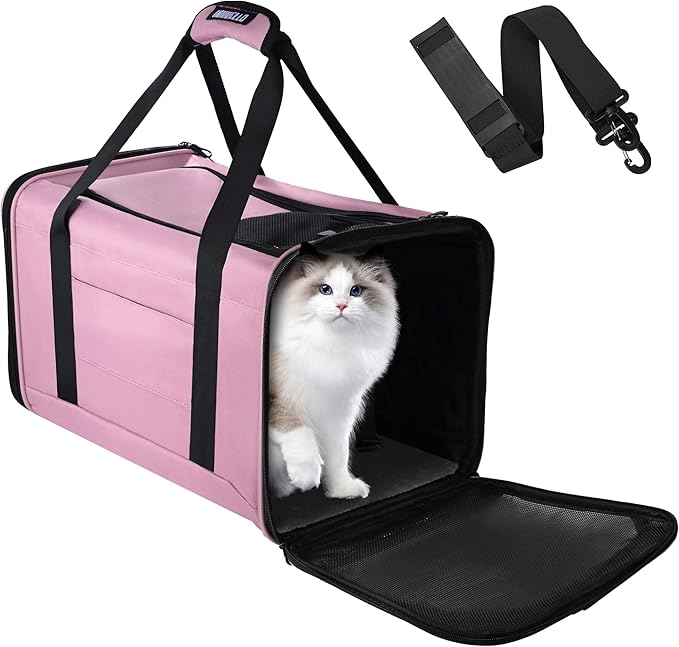 • 🎀Special Design: The soft cat carrier comes with a large side pocket on the side for snacks, jugs, toys and more. The front has a horizontal belt design, can be put on the suitcase, drag and use, convenient and labor-saving.