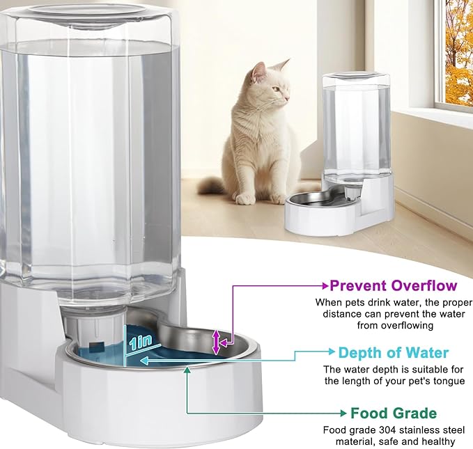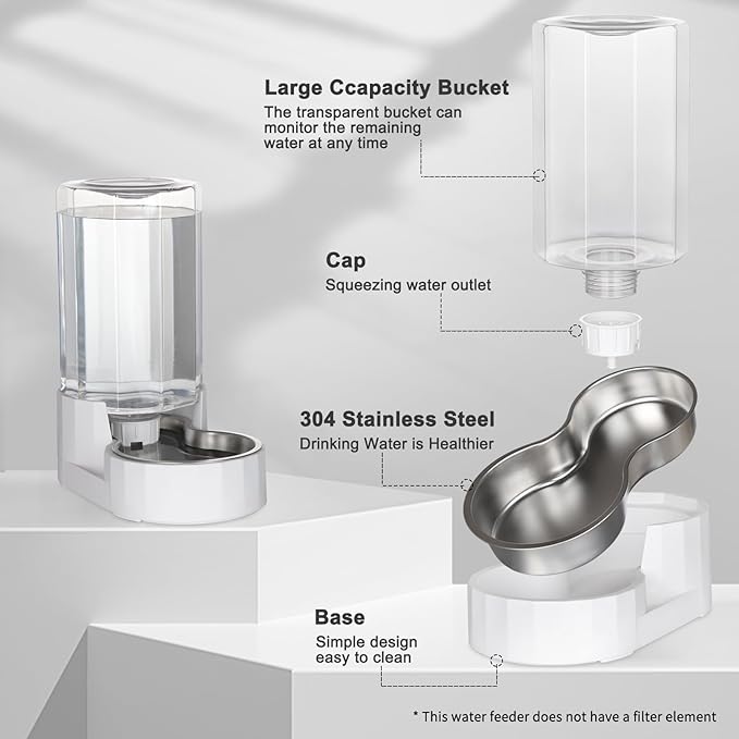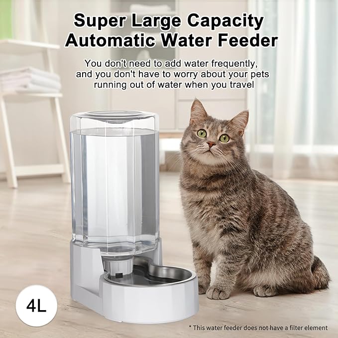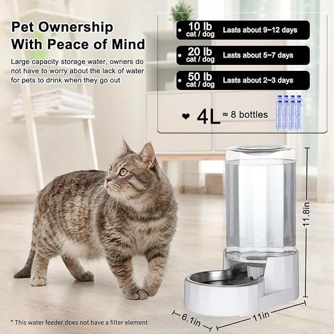 • 【Large Capacity】 This pet water dispenser has a capacity of 4L, sufficient enough to ensure a good amount of water for small to medium sized dogs and cats. The water dispenser fills the bottle by gravity, reducing the number of times you have to refill your pet's water and the time it takes to do so, making it ideal for pet owners when they need to go out for long periods of time. (Warm tips: This product is not equipped with a filter.)
