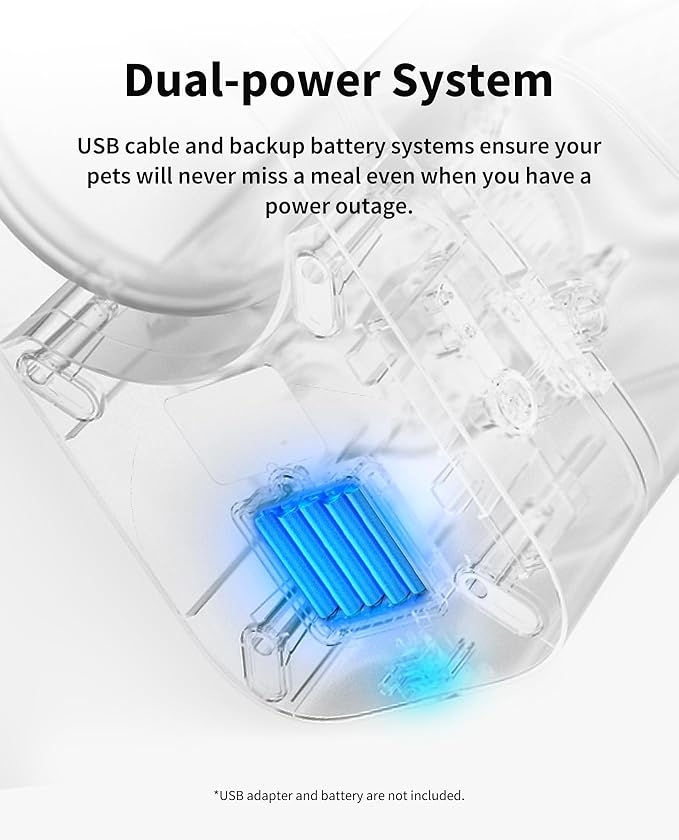 • Never Miss a Meal with Dual Power System: The automatic pet feeder comes with a USB power cable and can also be powered with back-up 3A batteries to prevent power outage, ensuring scheduled feeding is consistent. Please note, usb adapter and batteries are not included in the package, a 5V/1A adapter is required.