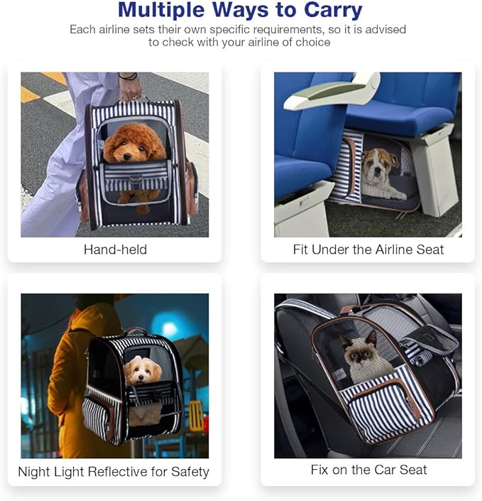 • EXPANDABLE & COLLAPSIBLE: This pet carrier backpack with an expandable back allows your pet to move around more comfortably and reduces the anxiety. And the carrier can collapse flat when not in use. Measures 14.17x12.59x17.32 inch, easily fits most small/medium-sized pets, weighing up to 18 lbs. Each airline sets their own specific requirements, so it is advised to check with your airline of choice.