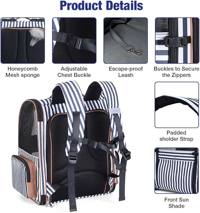 Lekebobor Extra Large Cat Backpack Carrier Expandable Pet Carrier Backpack for Small Dogs Medium Cats Fit Up to 18 Lbs, Dog Backpack Carrier, Foldable Puppy Backpack Carrier for Travel, Hiking,Striped