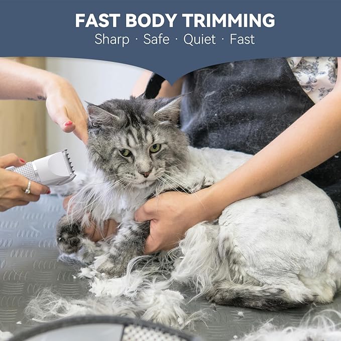 • Ultra-Quiet : The silent cat clipper’s noise when working is below 50dp,making it ideal for cats who are sensitive to noise. Trim your beloved feline's paws, face, ears, legs, and other areas without causing any fear or anxiety. For long haired cats and knotted cat, please first trim their hair to the appropriate length with steel scissors and combs, then use 3-in-1 electric trimmer for body trimming to avoid pulling,