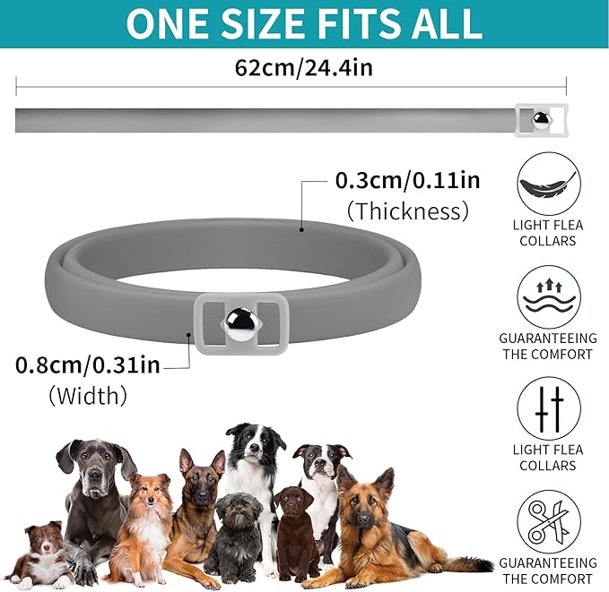 • 💫ADJUSTABLE & COMFORTABLE💫 - This flea collar for dogs is 24.4 inches/62 cm long and can be easily cut to fit different sizes of dogs for optimal adaptability. Additionally, the soft and lightweight texture, as well as the multiple attractive colors choice, ensures optimal comfort for your dog and looks fashionable and adorable.