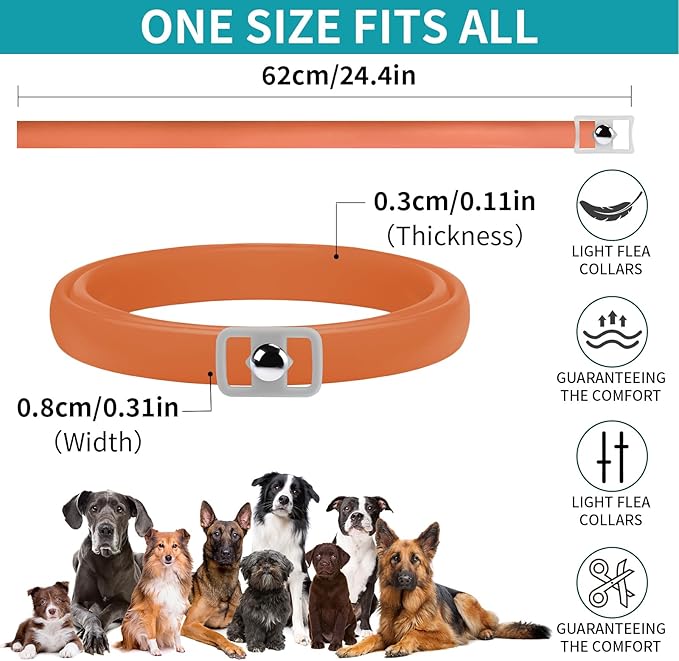 • ADJUSTABLE & COMFORTABLE - This flea collar for dogs is 24.4 inches/62 cm long and can be easily cut to fit different sizes of dogs for optimal adaptability. Additionally, the soft and lightweight texture, as well as the multiple attractive colors choice, ensures optimal comfort for your dog and looks fashionable and adorable.