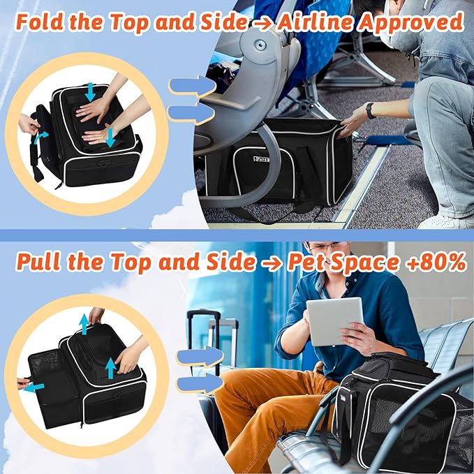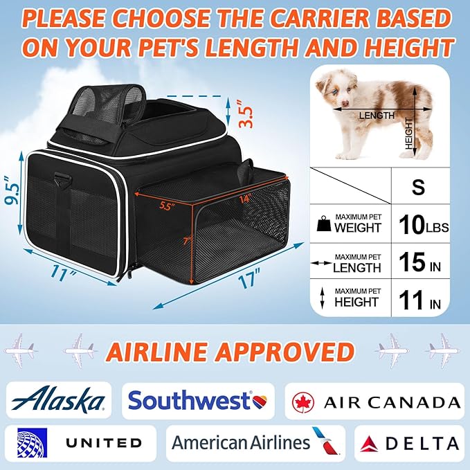 Top and Side Expandable Pet Carrier 17x11x9.5 Inches Alaska Airline Approved, Soft-Sided Carrier for Small Cats and Dogs with Locking Safety Zippers and Anti-Scratch Mesh(Black)