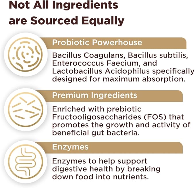 • Probiotic Powerhouse: Including probiotics such as, Bacillus Coagulans, Bacillus subtilis, Enterococcus Faecium, and Lactobacillus Acidophilus specifically designed for maximum absorption. These probiotics help maintain a healthy gut flora balance, boost the immune system, and improve digestion for your dog.